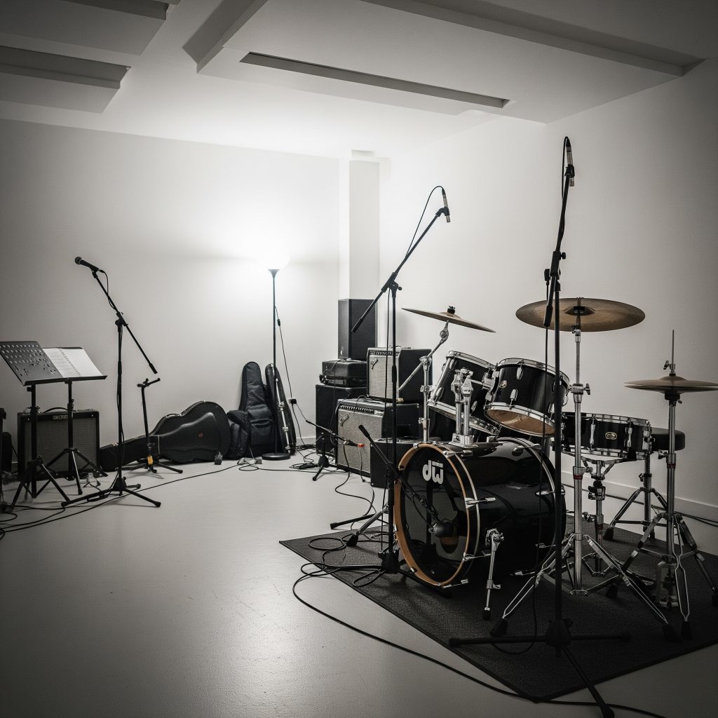 Disponemos de. 5 salas de ensayo de uso compartido para su alquiler, una de ellas con una batería disponible.