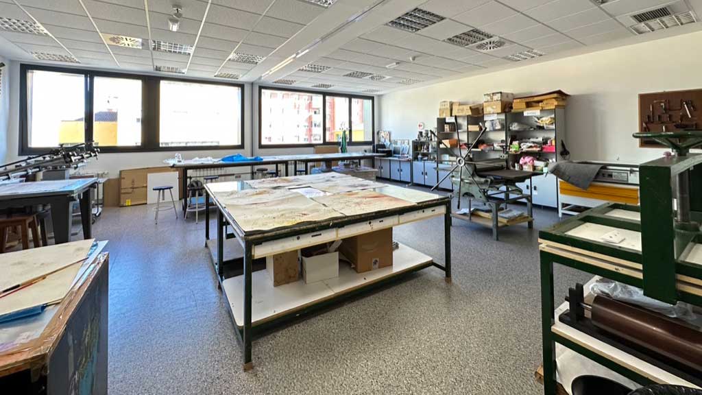 El taller de grabado cuenta con una gran superficie, está equipada con mesas, tórculo, insoladora y todo el equipo necesario para trabajos de grabado y serigrafía.