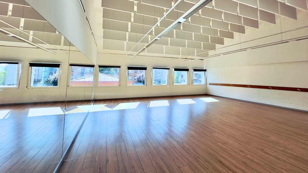 La sala de baile cuenta con una gran superficie, suelo de parquet, amplios ventanales y una pared totalmente cubierta de espejos.
